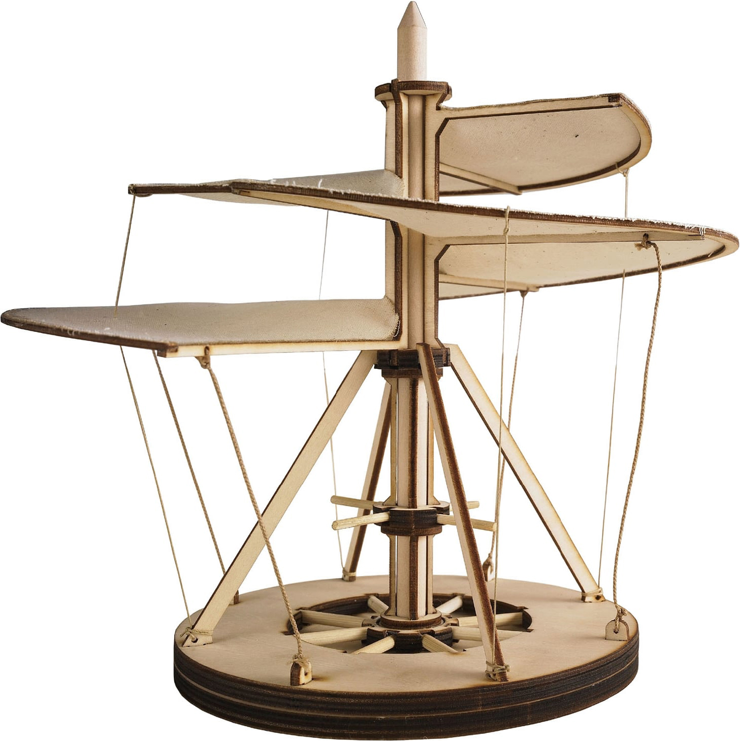 Leonardo arriva a ipotizzare e formulare in anticipo di secoli l’efficacia trattiva dell’elica. La vite ha un diametro di 5 metri ed è fatta di canne, tela di lino e filo di ferro.. Doveva essere azionata da quattro uomini che, per far ruotare l’albero, poggiavano i piedi sulla piattaforma centrale e, con le mani, facevano forza sulle rispettive barre.